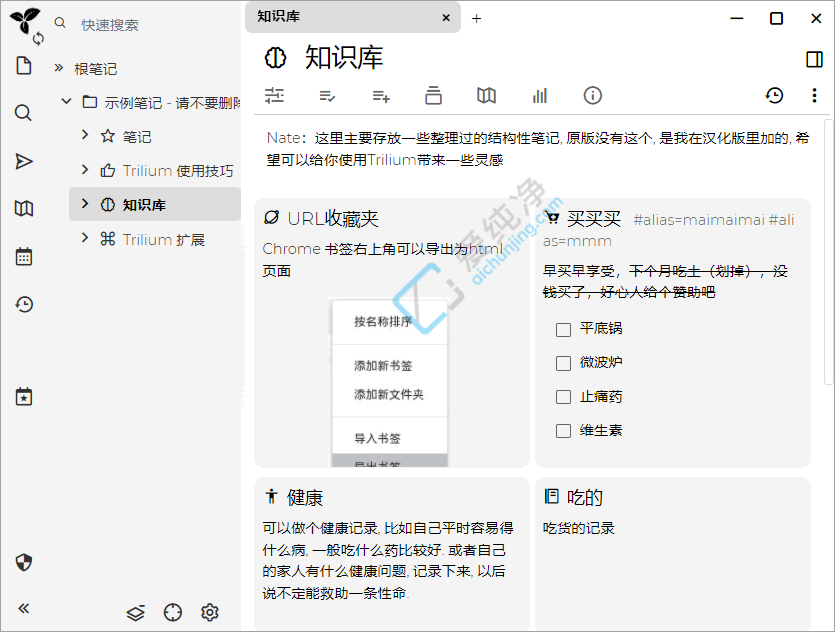 功能强大:Trilium Notes 支持 Markdown 和富文本编辑器,可以添加标签、链接、附件等元素,还可以使用全文搜索和过滤器来快速查找笔记。